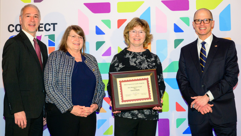 Hadley Select Board Chair Molly Keegan, second from right, poses with Hadley’s risk management award during the MIIA Annual Business Meeting in Boston on Jan. 25. Standing with her, left to right, are MIIA Chair and Chelmsford Town Manager Paul Cohen; Lin Chabra, MIIA’s senior manager of risk management; and MMA Executive Director Adam Chapdelaine.